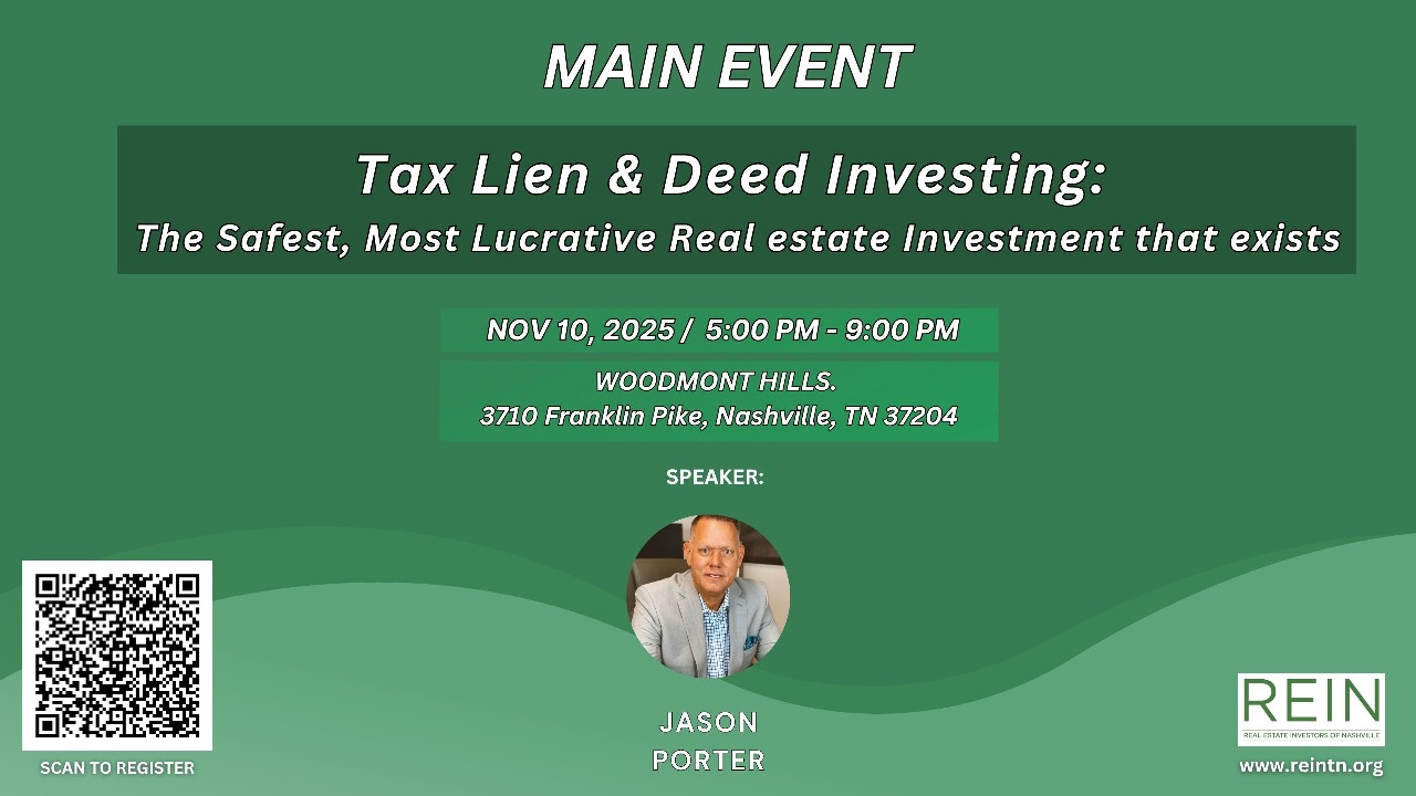 Looking for a low-risk, high-reward strategy to grow your real estate portfolio? Join us for an exclusive in-person training with Jason Porter – The Tax Lien Tutor, best-selling author of Real Good Deeds and one of America’s foremost authorities in tax lien and deed investing.