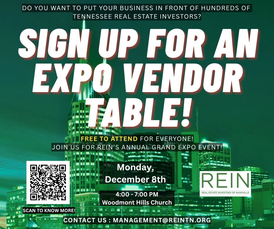 Do you want to put your business in front of hundreds of Tennessee real estate investors? You need a table at REIN's EXPO! This is an amazing chance to promote your business, meet Nashville's top real estate investors, and get new clients! The EXPO will be held Monday, December 8th as a chance for vendors to show off to our members and meet the Nashville community. And we want you to be a part of the fun and festivities!